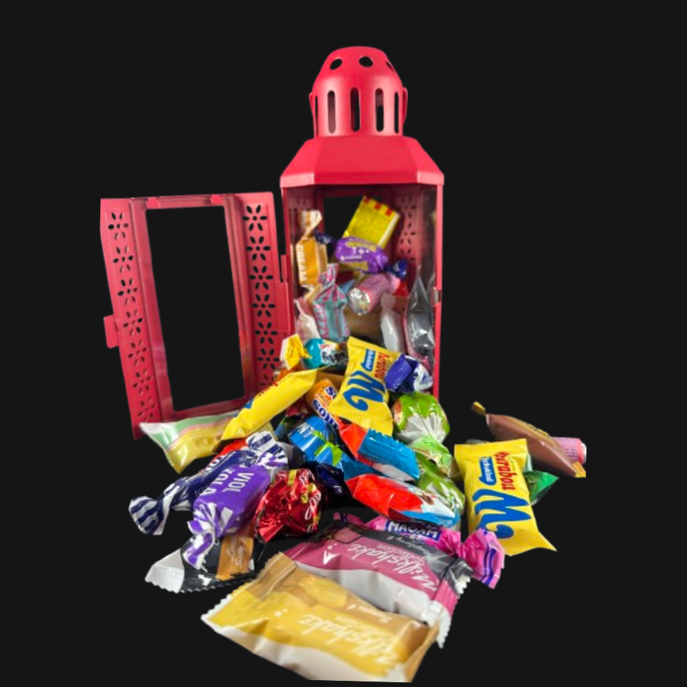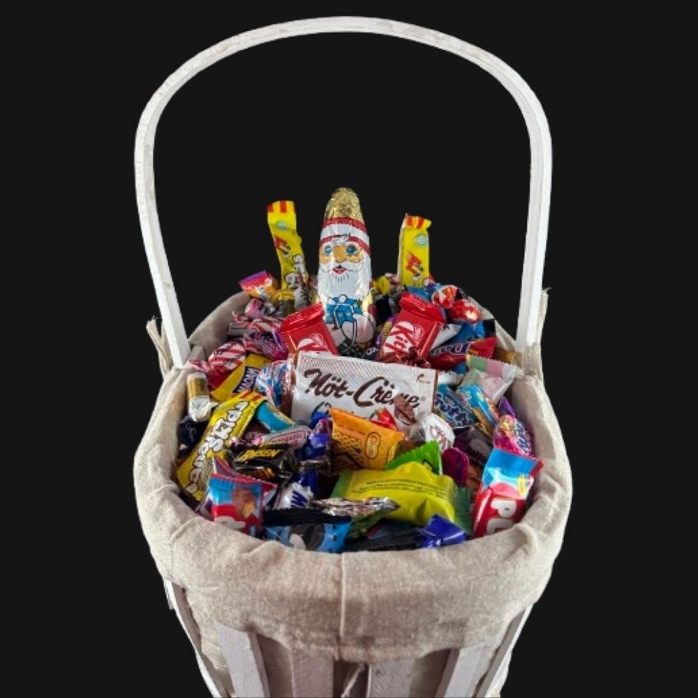 Vår egen härliga godisblandning med papper på, lagt i ett jättefint trätråg med texten GOD JUL, inslaget i cellofan och band/rosett.